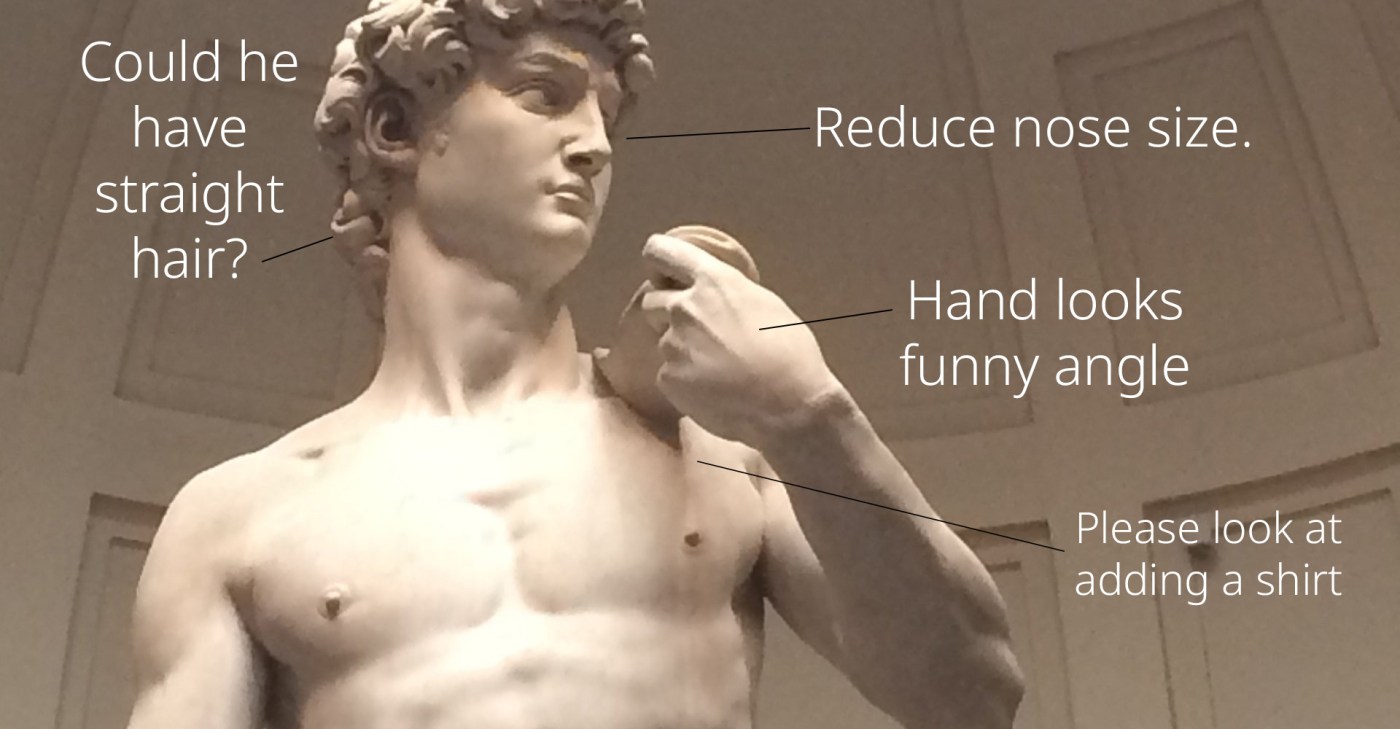 In other words, the problem may not be that the nose of David is too big, but that the face is too short.